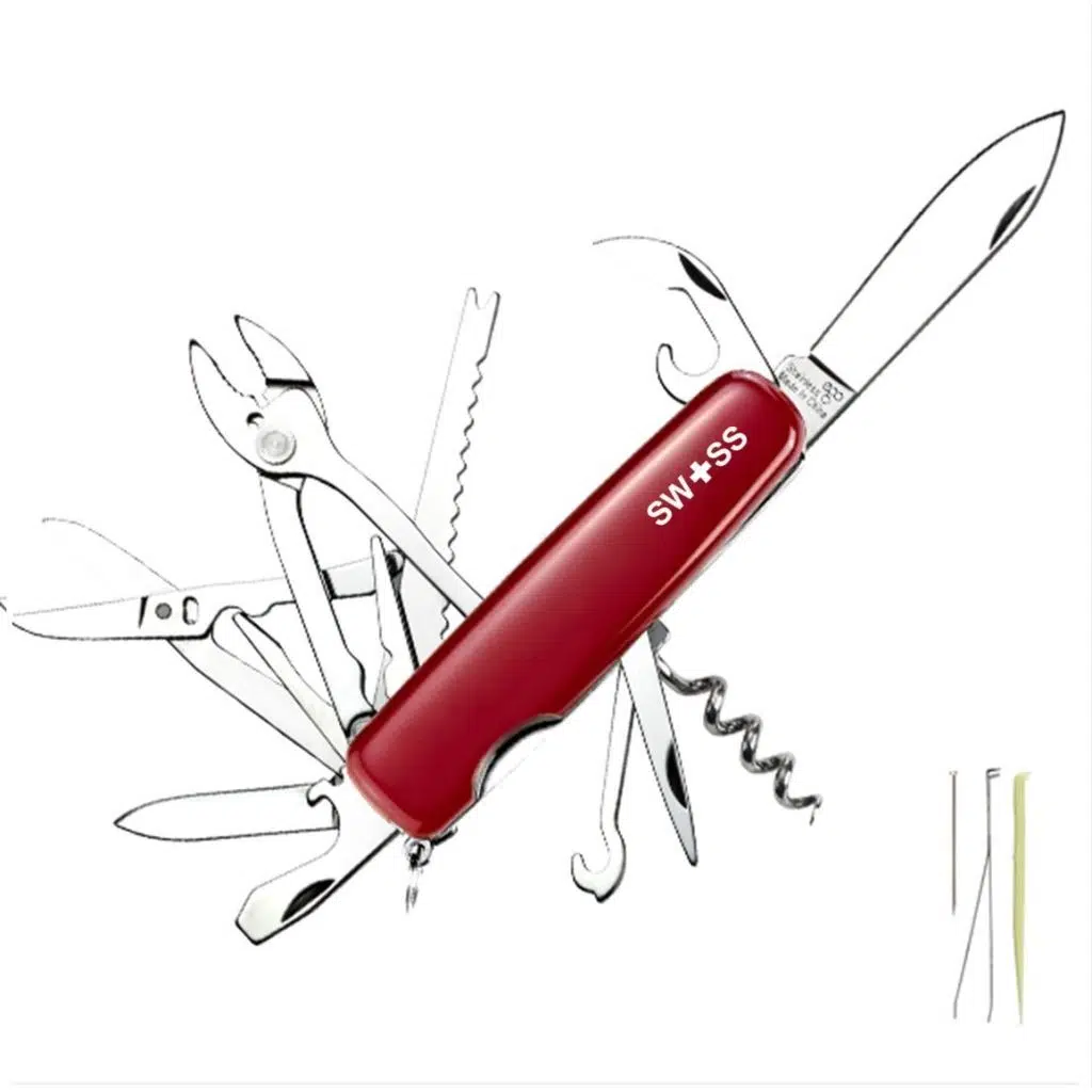 SWISS Fonksiyonlu Paslanmaz Çelik Orijinal İsviçre Çakısı (A01.12), geniş bir fonksiyon yelpazesi sunar ve her türlü ihtiyacınıza hitap eder. İşte çakının sahip olduğu temel araçlar ve fonksiyonlar: